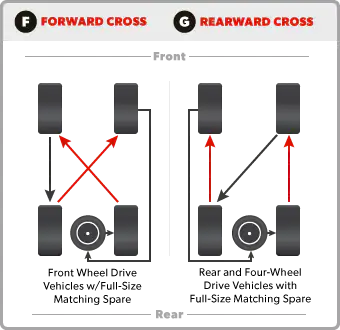 - Với xe dẫn động 4 bánh: 4 lốp đảo chéo nhau (hình 2). Cách đảo này cũng có thể dùng được cho cả xe dẫn động cầu trước và cầu sau
