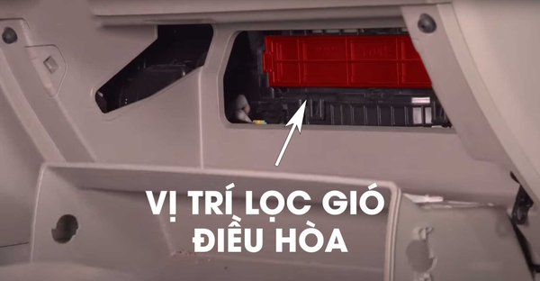 Mở hộc để đồ phía ghế phụ, nhấn vào lẫy ở hai bên rồi từ từ nhấc hộc để đồ ra ngoài. Lúc này bạn sẽ thấy nắp hộp lọc gió nằm bên trong.