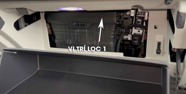 Mở hộc để đồ phía ghế phụ, nhấn vào lẫy ở hai bên rồi từ từ nhấc hộc để đồ ra ngoài. Lúc này bạn sẽ thấy nắp hộp lọc gió nằm bên trong.