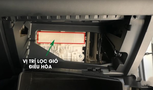 Mở hộc để đồ phía ghế phụ, nhấn vào lẫy ở hai bên rồi từ từ nhấc hộc để đồ ra ngoài. Lúc này bạn sẽ thấy nắp hộp lọc gió nằm bên trong.