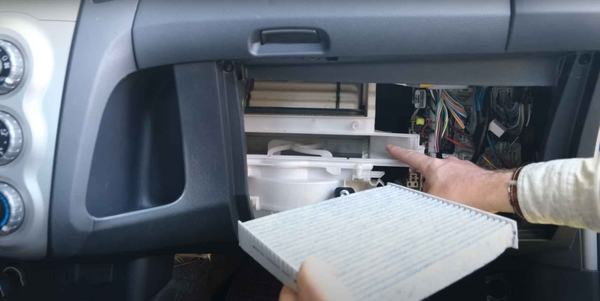 Hộp chứa lọc điều hòa Toyota Yaris đặt ngay sau hộc để đồ của ghế phụ