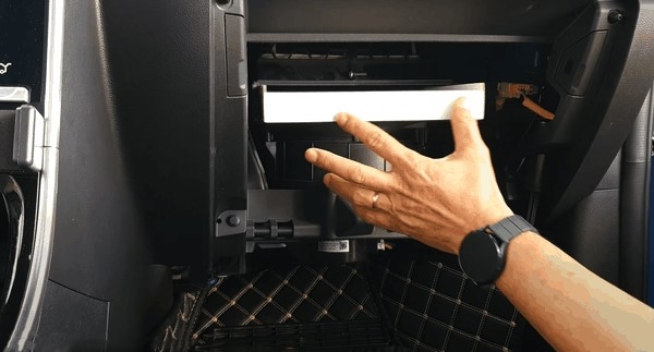 Mở hộc để đồ phía ghế phụ, nhấn vào lẫy ở hai bên rồi từ từ nhấc hộc để đồ ra ngoài. Lúc này bạn sẽ thấy nắp hộp lọc gió nằm bên trong.