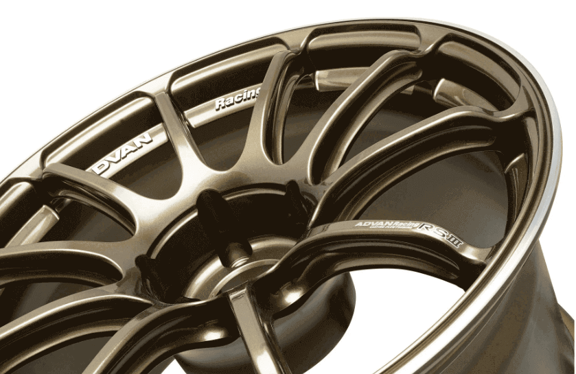 Logo “ADVAN Racing” được dập nổi trên mặt vành giữa các nan hoa bằng máy xử lý khắc 3D. Logo “ADVAN Racing RS3” được dán trên bề mặt của chấu.