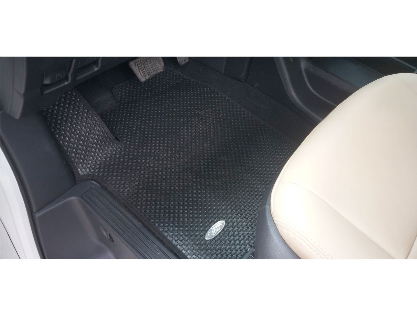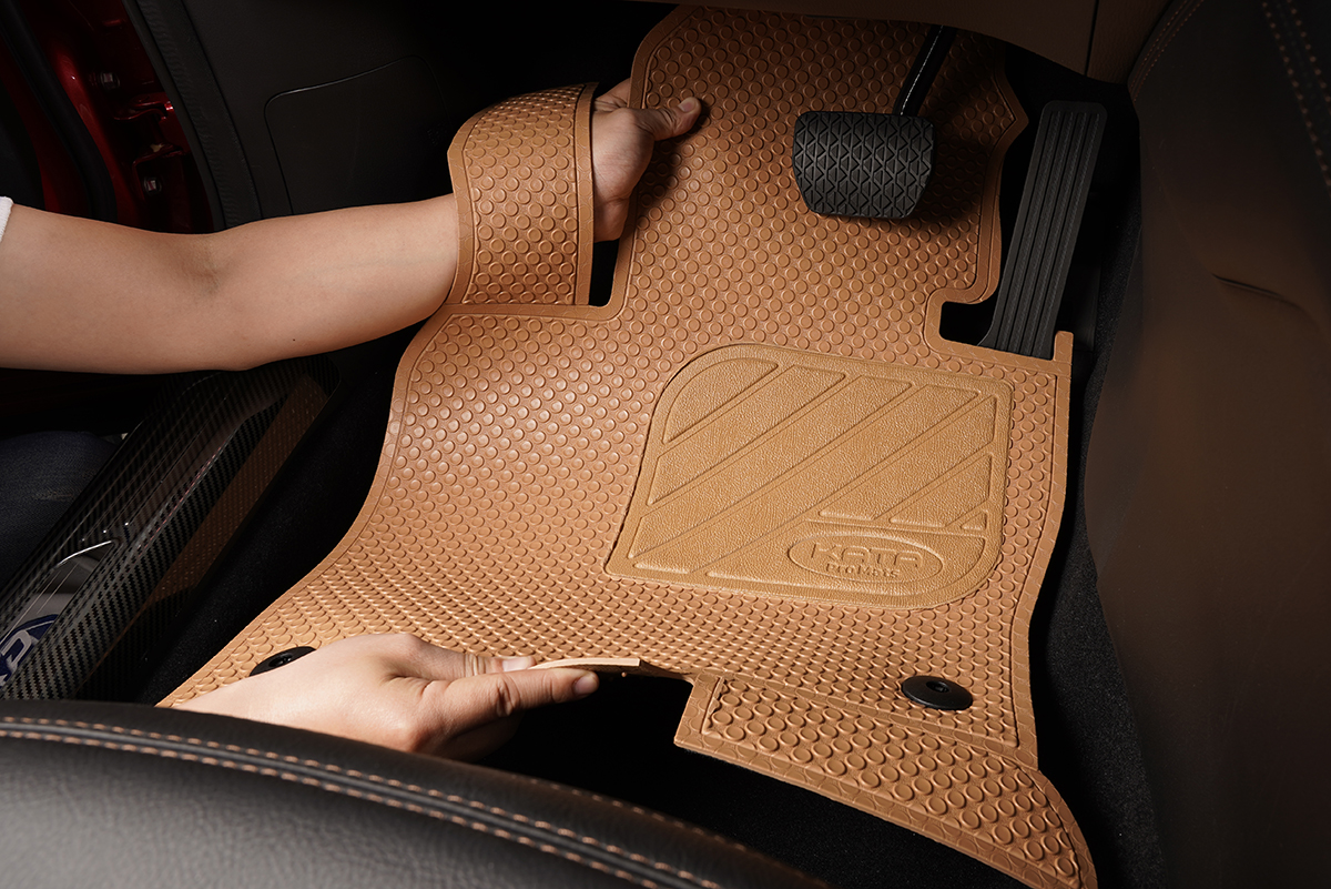 Trước tiên, lấy thảm ở khoang ghế trước đặt lên ngay ngắn, luồn các tai thảm xuống dưới gầm xe và cố định chúng bằng cúc bấm.