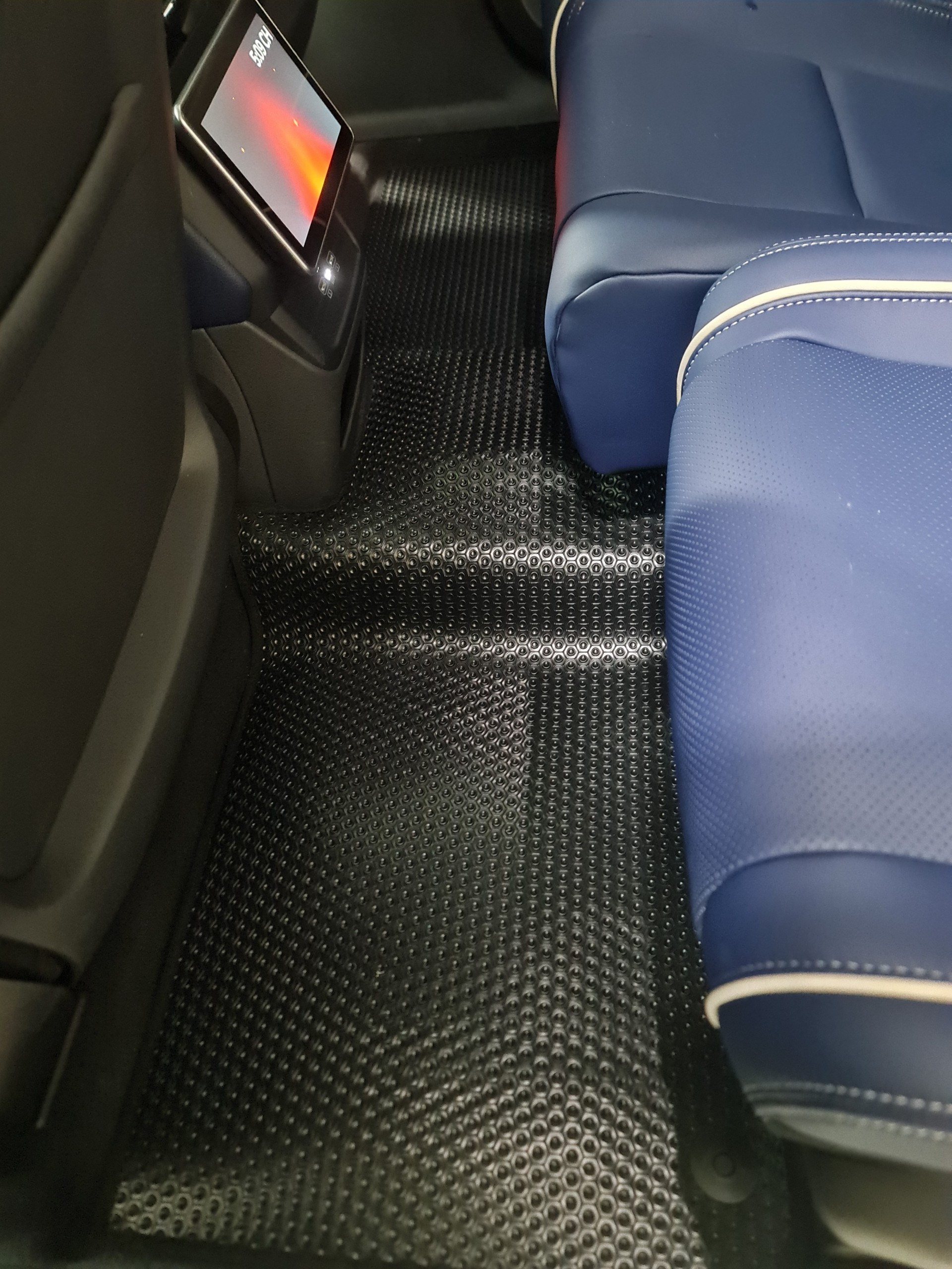 Ở hàng ghế sau lắp thảm lót sàn xe ô tô tương tự khoang trên, đưa thảm đặt lên vị trí ghế sau, căn chỉnh ngay ngắn, bo khúc với mặt sàn rồi cài cúc ở các thành xe.